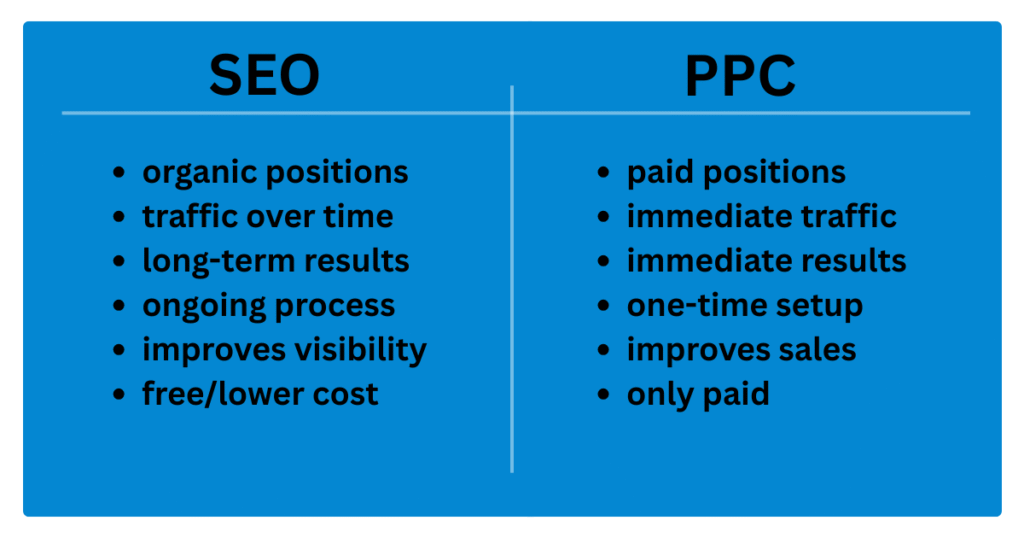 PPC generates immediate traffic and leads, while SEO investments build. You don’t have to wait for six months before you see results. You can start generating revenue right away while building long-term assets.