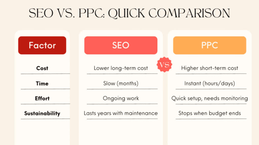SEO vs PPC: Quick Comparison Table